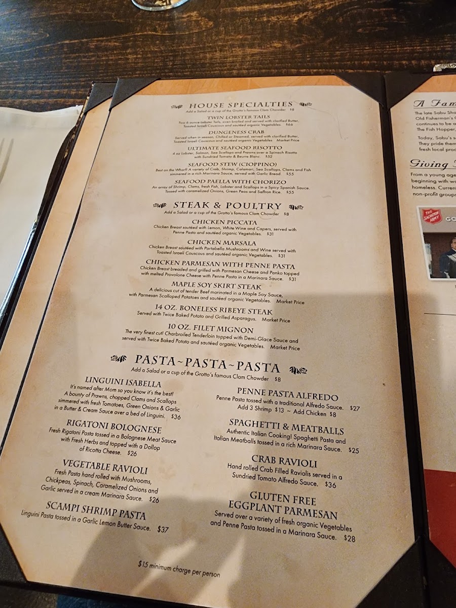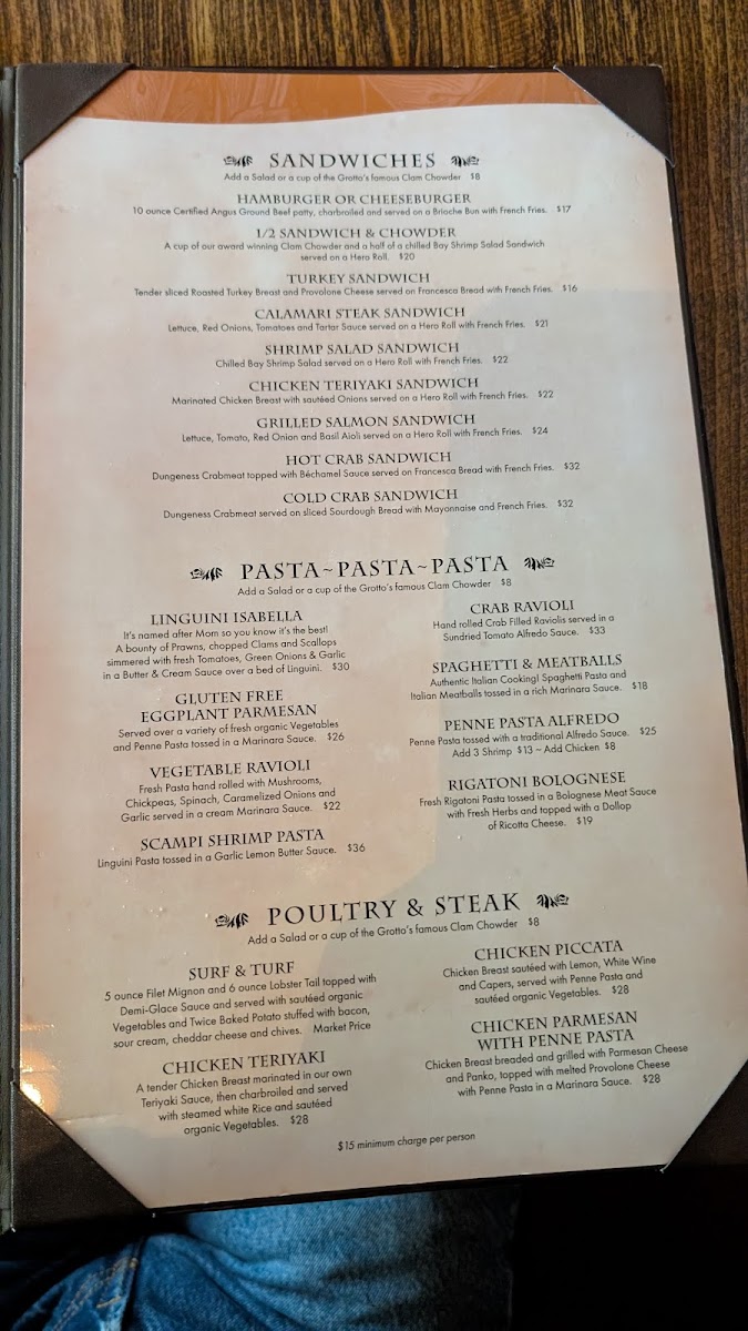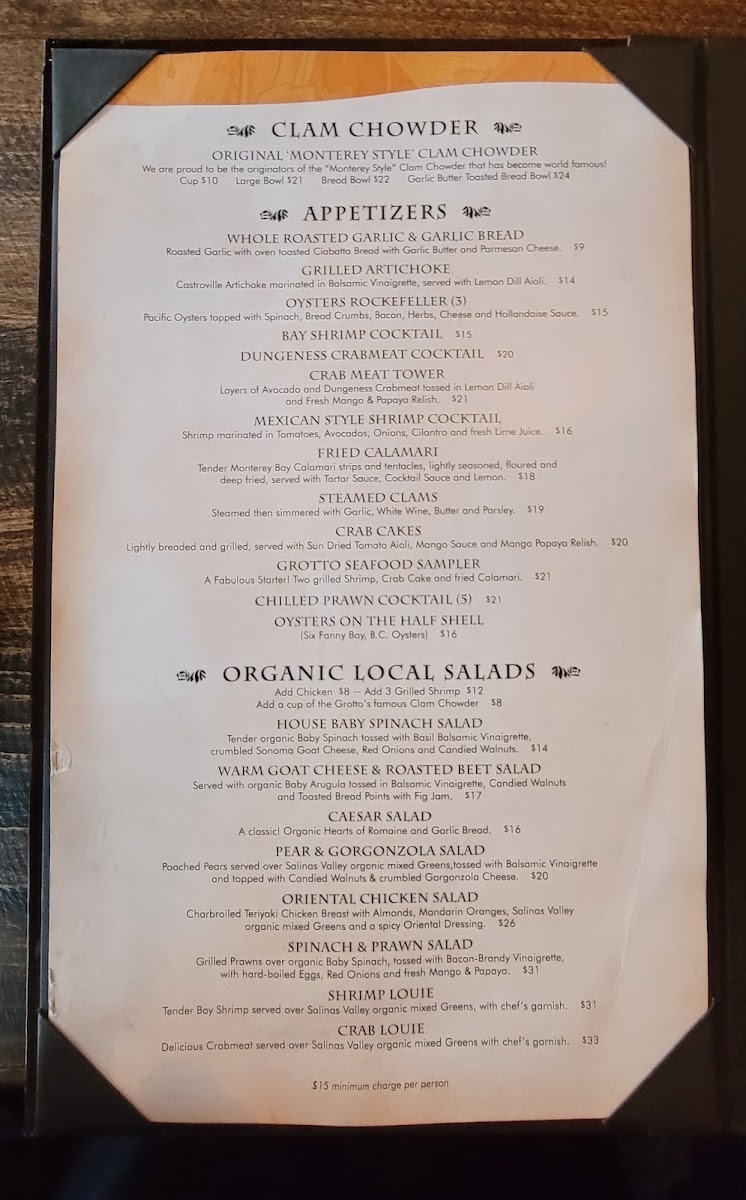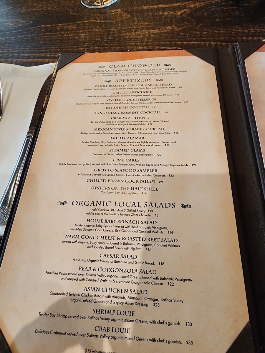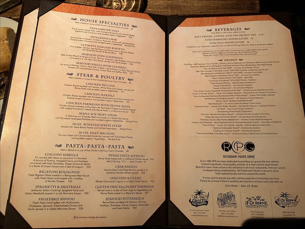 Old Fisherman’s Grotto is a must-visit on Monterey’s Cannery Row! The atmosphere is warm and inviting, with beautiful waterfront views and a cozy, upscale feel. The clam chowder is hands-down the best I’ve ever had—rich, creamy, and perfectly seasoned. Every dish we tried was fresh and flavorful, especially the seafood pasta and grilled salmon. Service was top-notch; our server was attentive, friendly, and made great recommendations. The menu offers something for everyone, and the quality is consistently excellent. It’s a bit pricier, but absolutely worth it for the experience. I can’t wait to return—highly recommended for any seafood lover!